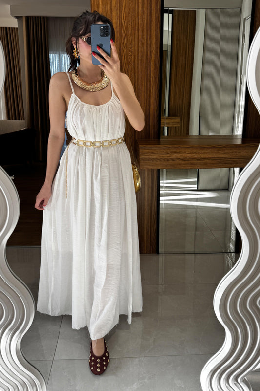 Klenke Beyaz Bol Kesimli Salaş Dökümlü Maxi Elbise