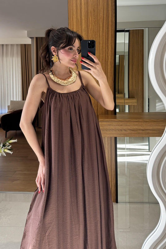 Klenke Kahve Bol Kesimli Salaş Dökümlü Maxi Elbise