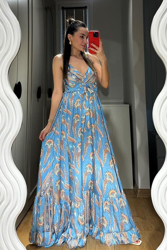 3 AL 2 ÖDESare Desenli Saten Mavi Elbise