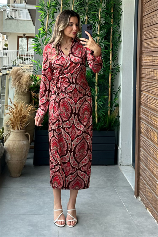 3 AL 2 ÖDEKırmızı etnik desenli saten elbise