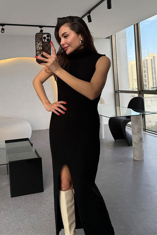 3 AL 2 ÖDEKalp yaka siyah deri elbise