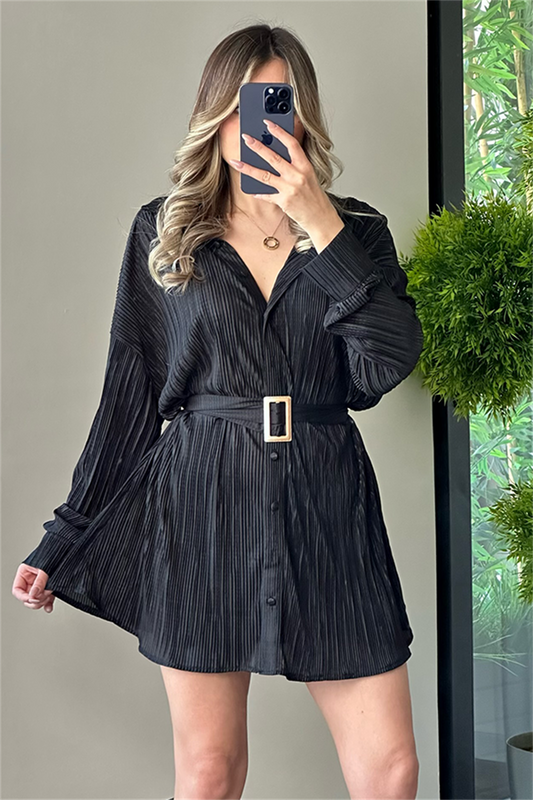3 AL 2 ÖDESaten kırinkıl kumaş kemerli siyah elbise