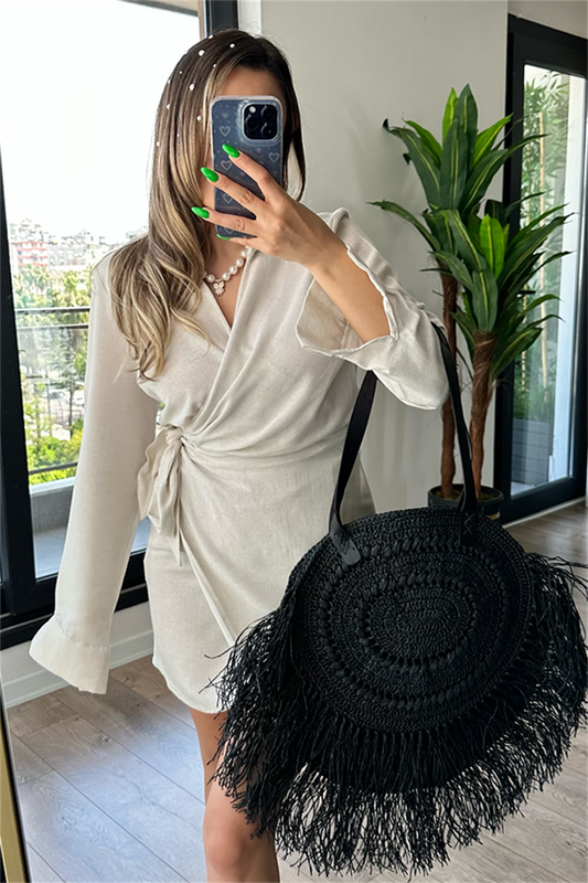 3 AL 2 ÖDEKeten yandan bağlamalı ekru elbise