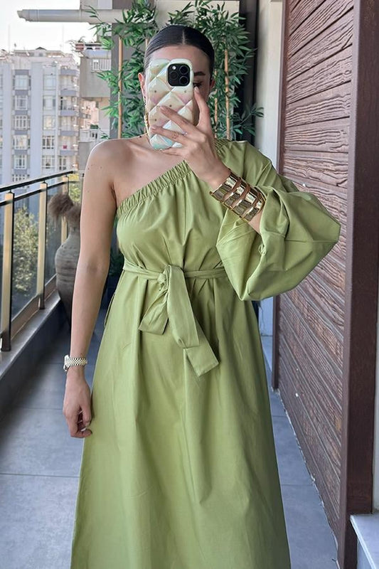 Kelsey Tek Omuz Poplin Kemerli Elbise - Yağ Yeşil
