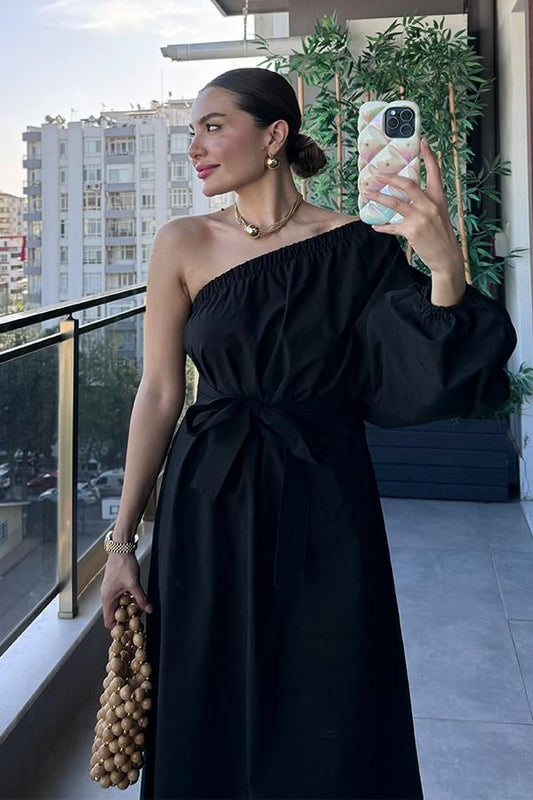 Kelsey Tek Omuz Poplin Kemerli Elbise - Siyah