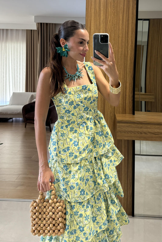 3 AL 2 ÖDEKenya Çiçek Desenli Kat Kat Maxi Elbise