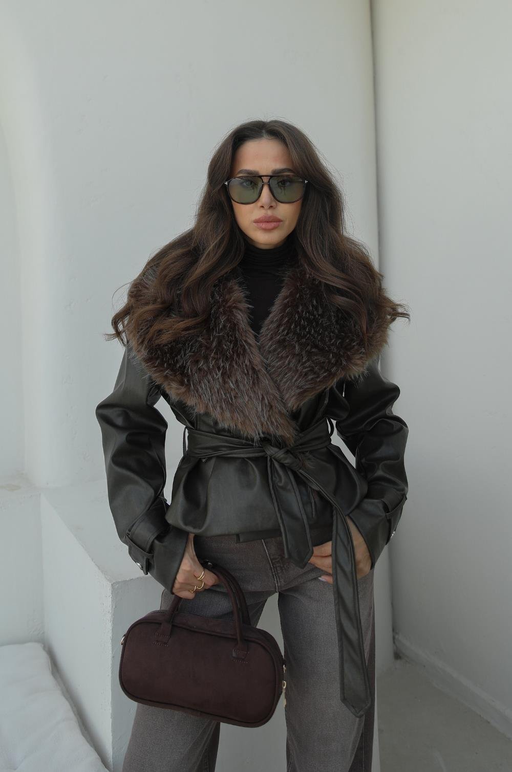 HAKI YAKASI KÜRK DETAYLI DERI CEKET