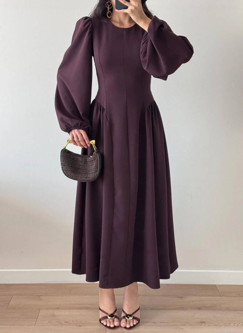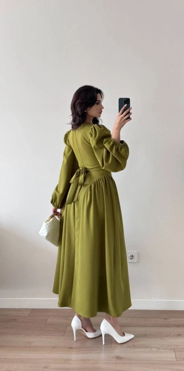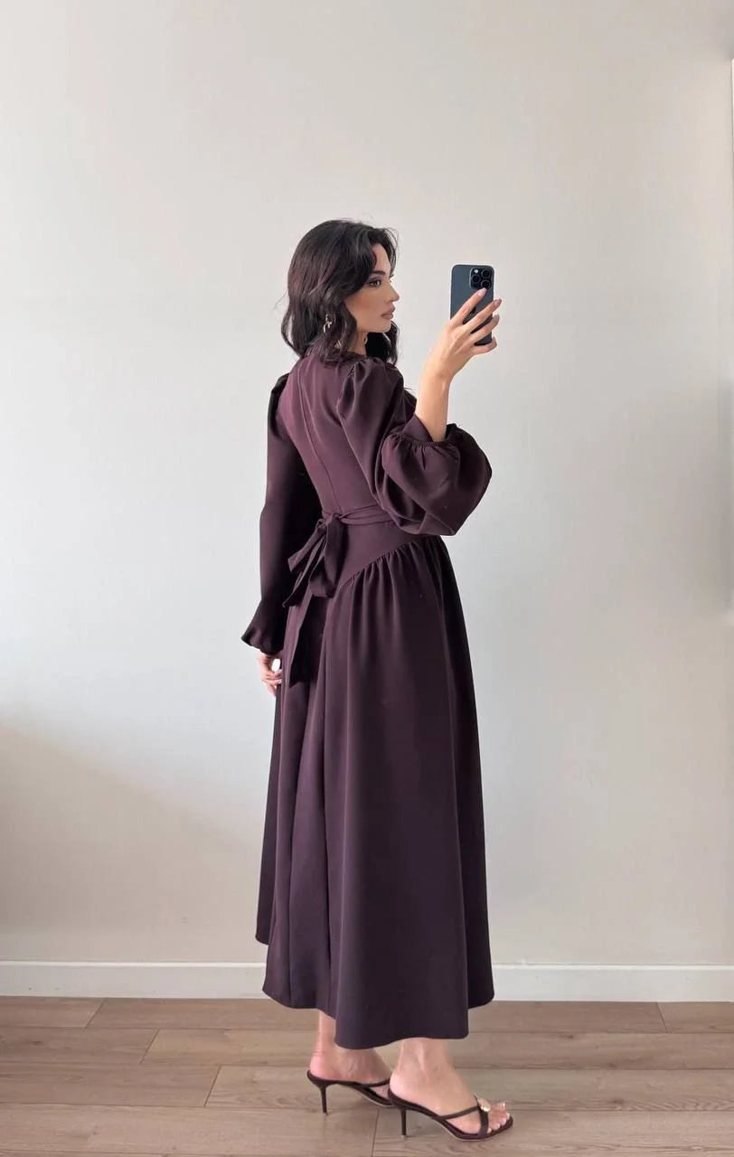 Sırt Kuşak Bağlamalı Uzun Kollu Maxi Balon Kol Elbise