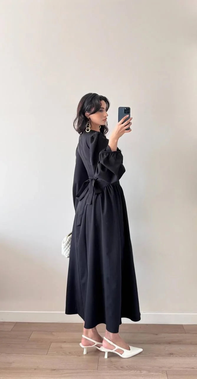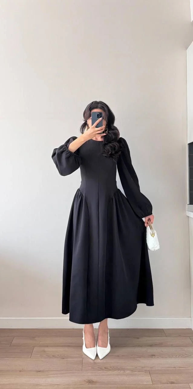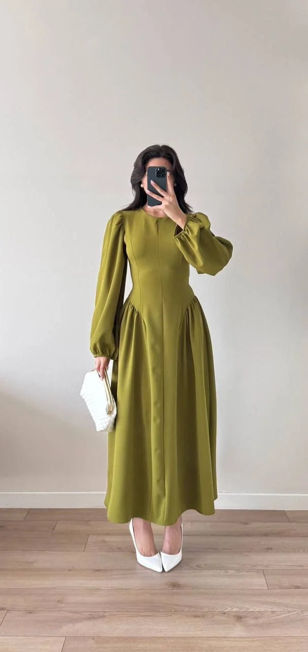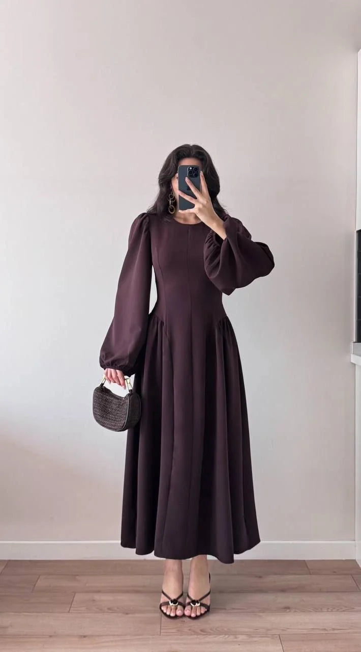 Sırt Kuşak Bağlamalı Uzun Kollu Maxi Balon Kol Elbise